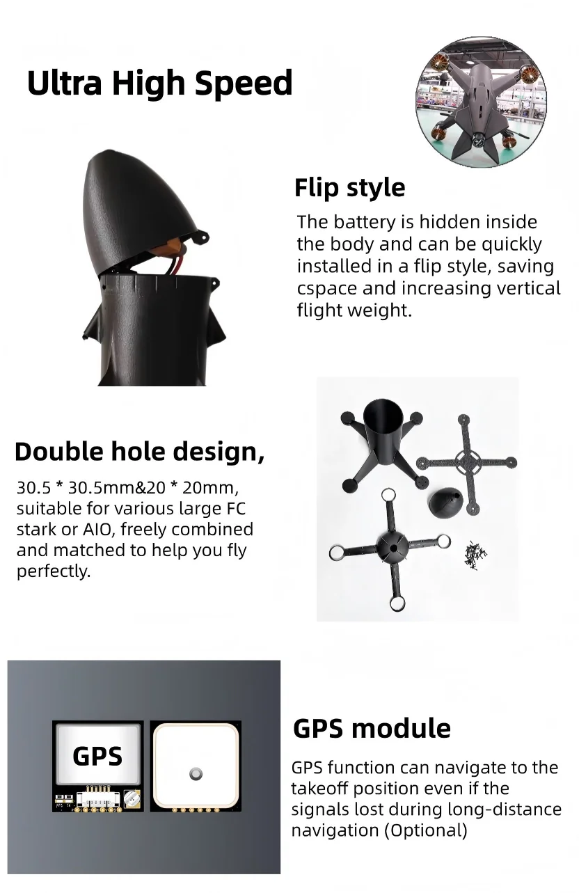 The battery is hidden inside the body and can be quickly installed in a flip style, saving space and increasing vertical flight weight